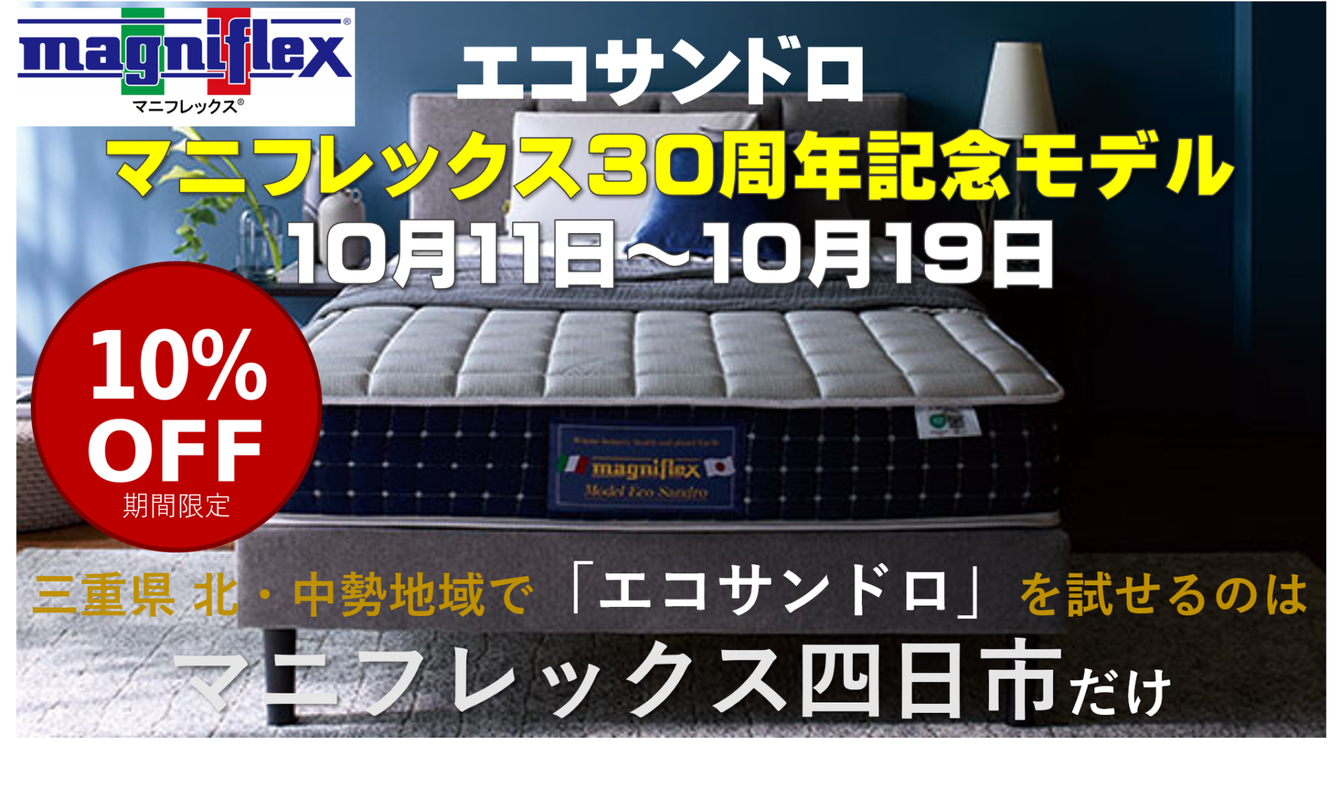 それを記念してマニフレックス・エコサンドロモデルの 10%OFFキャンペーンを実施します。 ぜひこの期間に、最上の眠りをご体感ください。